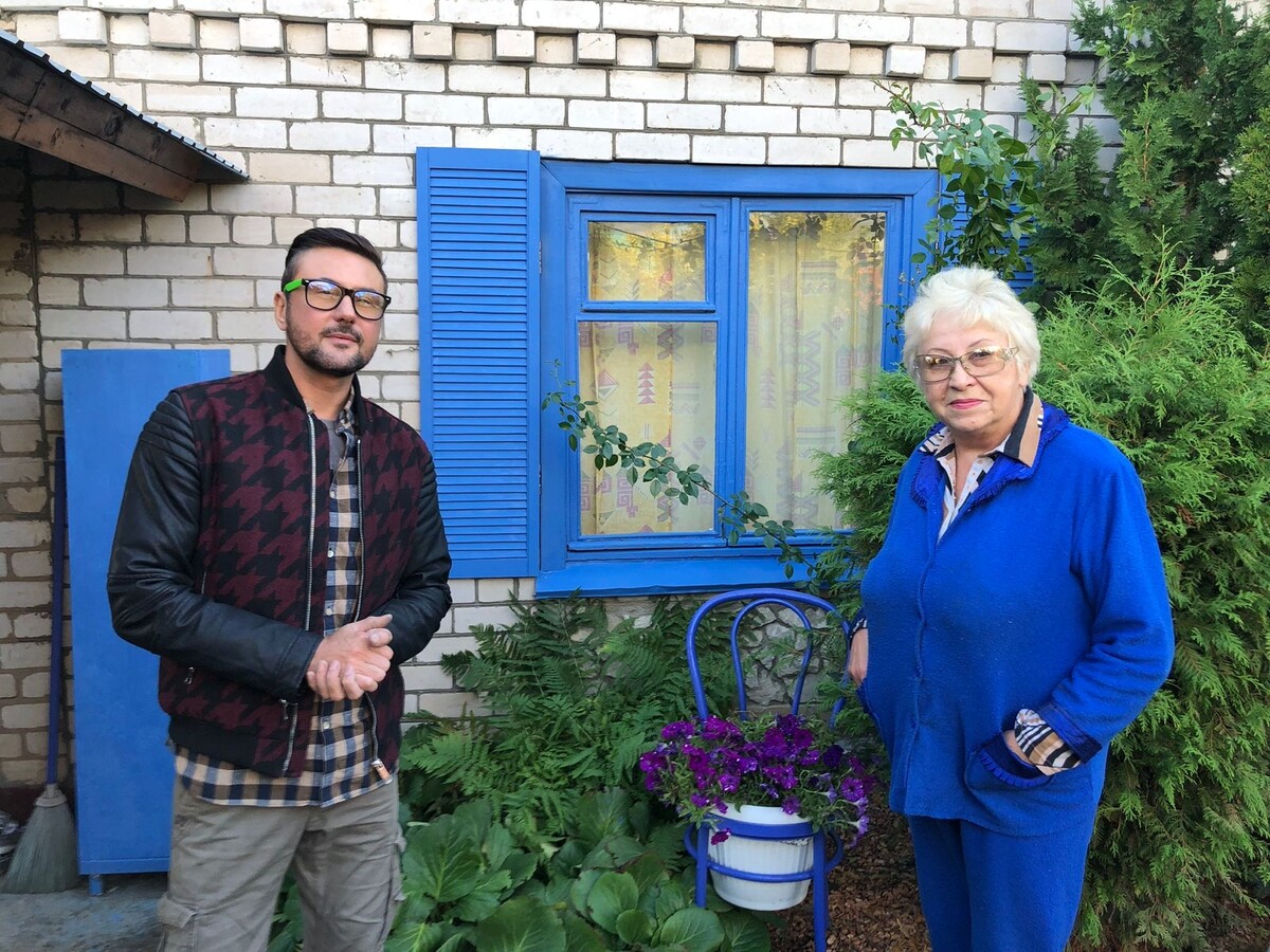 Нашел фото со старой маминой дачи. Пытался сделать средиземноморский уголок. На окна прикрутил деревянные мебельные решетки для шкафов, они недорогие, продаются в строительных магазинах. У старого стула убрал седалище, покрасил синей краской. Старенький шкаф-пенал тоже обновил красочкой. Фиолетовая петуния хорошо сочетается с деталями синего цвета. Растения: шаровидная туя, плетистая роза, веточку которой в руках держит маменька, росла не очень, это тенистый уголок. А вот папоротник и бадан чувствовали себя на этом месте замечательно. Голь на выдумку хитра - это тот самый случай. Дачный угодник, Виталий Декабрёв.