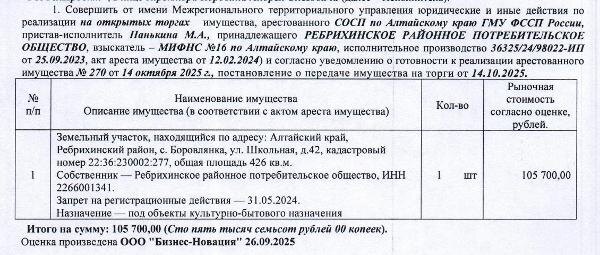 Название: Лот№6 Земельный участок, назначение – земли населенных пунктов под объекты культурно-бытового назначения, кадастровый № 22:36:230002:277, площадь 426 кв.м., адрес: Алтайский край, Ребрихинский район, с. Боровлянка, ул. Школьная, 42. Начальная цена 105 700 руб. 00 коп. (Ребрихинское районное потребительское общество, запреты на совершение регистрационных действий) (270/сосп). Канал: Госземля Алтайский край Область: край Алтайский Ребрихинский район Район: с. Боровлянка Населенный пункт: ул. Школьная, 42. Локация: Смотреть на карте ВРИ: Бытовое обслуживание Кадастровый номер: 22:36:230002:277 Кадастровая стоимость: - Вид сделки: Продажа Площадь: 426 м² Начальная цена: 105700.00 руб. Дата завершения: 10.12.2025 Подробнее: ГИС ТОРГИ #госземля #земляотгосударства #земля #земельныйучасток #земельныеторги #торги #аукцион #продажаземли #продажа #алтайскийкрай