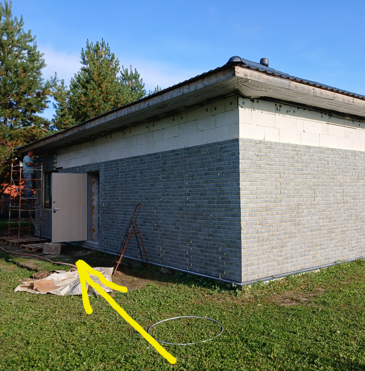 Это предпоследняя статья про строительство дома в 2025г. Все планируемые работы сделаны и даже немного больше. Сегодня я расскажу о том, что сделано сверх плана и что не вошло в прошлые статьи. Началось все с входной двери. В прошлый раз я вскольз упомянула, что пришлось срезать часть дверной коробки при монтаже теплопанелей, в связи с чем она начала провисать, закрывать ее стало проблематично, приходилось приподнимать. На этом фото видно, что в открытом виде дверь снизу мы подпираем камнем. Нам ее совсем не жалко, дверь была б/у и временным решением на период строительства. Но мы не ожидали, что покупать новую придется в этом году. Не просто новую, а хорошую итоговую, с терморазрывом. Слово для меня это новое, пришлось поизучать. Из-за разницы температур зимой (это когда на улице -20С°, а в доме +20С°) на двери появляется конденсат. Он замерзает, образуя наледь. Промерзает фурнитура: замки, ручка двери. На металле образуется ржавчина, что сокращает срок службы двери. Чтобы этого изб