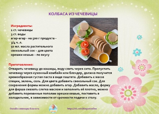 🌭 КОЛБАСА ИЗ ЧЕЧЕВИЦЫ 🌀 ИНГРЕДИЕНТЫ: 1 ст. чечевицы 3 ст. воды агар-агар - на 500 г продукта -3/4 ч. л. 50 мл. масла растительного свекольный сок – для цвета орешки кешью – по вкусу 🌀 ПРИГОТОВЛЕНИЕ: Отварить чечевицу до кашицы, воду слить через сито. Пропустить чечевицу через кухонный комбайн или блендер, должна получится кремообразная густая паста в виде паштета. Добавить к массе специи, зелень, соль. Для цвета добавить свекольный сок. Для сохранения формы можно добавить агар. Добавить масло, форму для фарша смазать слегка маслом и заполнить её плотно, можно добавить порезанные пополам орешки кешью, поставить в холодильник, в зависимости от срочности подачи к столу.