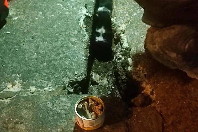 🐈⬛ Чёрно-белого кота, застрявшего в набережной Петербурга, удалось выманить наружу