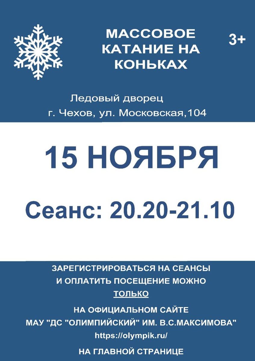 ✨ МАССОВОЕ КАТАНИЕ на льду ⛸️ ❄️Сеанс: 20:20 - 21:10 🎵 К вашим услугам качественный лед, хорошая музыка, прокат и заточка коньков. ℹ️ Размеры коньков: с 27 по 46. 💵 Стоимость проката: детские 200 руб., взрослые 300 руб. 🚫 Возраст: 3+ 📆 15.11.2025 🏢 Ледовый дворец спорта «Витязь» 📍 г. Чехов, ул. Московская, д.104 🔗 Купить билет: https://clck.ru/3NsBk2 ⭐Поддержать канал голосом ✅ Мероприятия Чехов https://dzen.ru/id/66cc4b48e9ef144699238a51 http://vk.com/chekhov_events http://dzen.ru/chekhov_events
