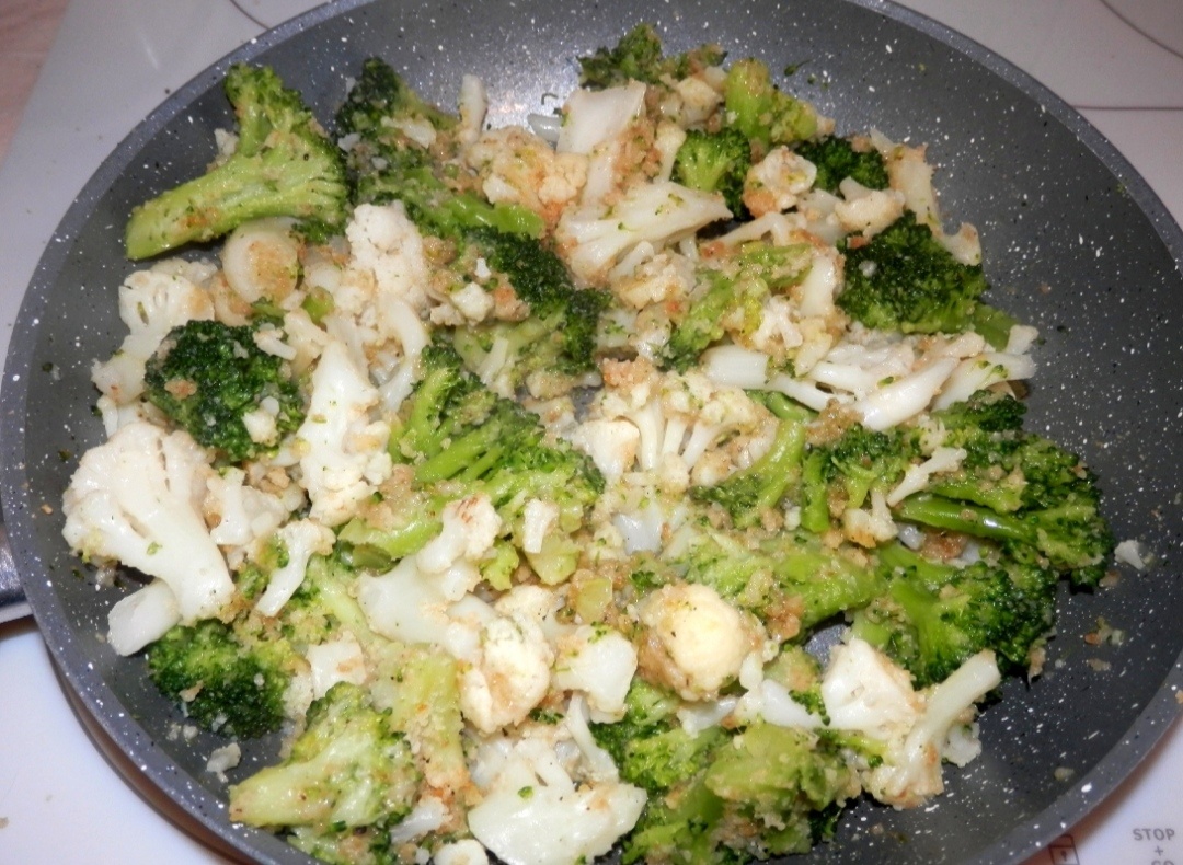 Для приготовления этого блюда можно использовать свежие овощи (тогда их надо отварить до полуготовности, слить воду и обдать ледяной водой), а можно использовать замороженные полуфабрикаты, что я и сделала. На сковороде разогреваем растительное масло и высыпаем туда цветную капусту и брокколи. Обжариваем, помешивая, пока не выпарится жидкость. Затем засыпаем панировочными сухарями (примерно 1/2 стакана). Быстро всё перемешиваем, солим и перчим. В миску разбиваем яйцо, добавляем молоко и соевый соус. Взбалтываем вилкой. Выливаем наш "омлет" на капустное ассорти тонкой струйкой по всей поверхности. Быстро размешиваем. Ждём, когда яйцо "схватится" и всё - блюдо готово! Всем мира, добра, красоты!