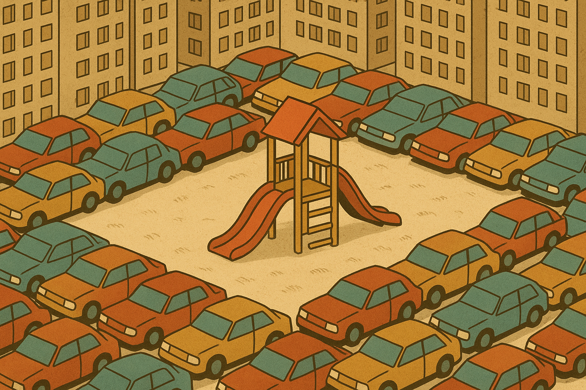 Если в моём детстве мы спокойно гоняли на великах по всем дворам, паркам и закоулкам (без страха, что наше колесо оставит боевой шрам на чьем-то бампере), то сейчас это редкость. Хоть московские власти постоянно рапортуют о велодорожках, инфраструктурах и пр.пр.пр., но это не про наш район, а про что-то где-то там, в параллельной, идеальной Москве. Здесь машинами заставлено ВСЁ. Подчас мусоровоз не может добраться до контейнеров, и их дворники возят с площадки к грузовику, демонстрируя чудеса логистики. Я не представляю, как гуляют дети, в окружении выхлопных труб, направленных на типовую горку с унылой песочницей. И ладно бы просто припаркованные машины жильцов, но тут же "Газели", такси, и другой коммерческий транспорт. Что они, простите, делают в жилом дворе? Спят?