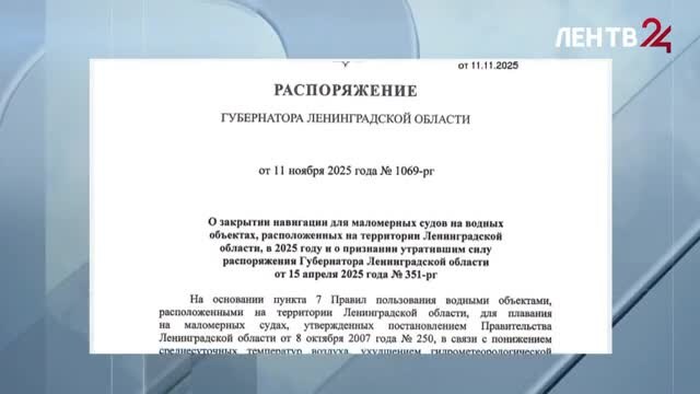 Опубликовано соответствующее распоряжение губернатора Александра Дрозденко. С 15 ноября на всех водных объектах Ленобласти официально закрывается навигация для маломерных судов. Опубликовано соответствующее распоряжение губернатора Александра Дрозденко. Оно касается лодок, катеров и гидроциклов. Решение связано с сезонным ухудшением погодных условий и ухудшением гидро метеорологической обстановки и ветро-волнового режима. Также прогнозируется раннее начало ледостава. Как правило, запрет действует до 16 апреля. Навигация открывается также по распоряжению главы региона.