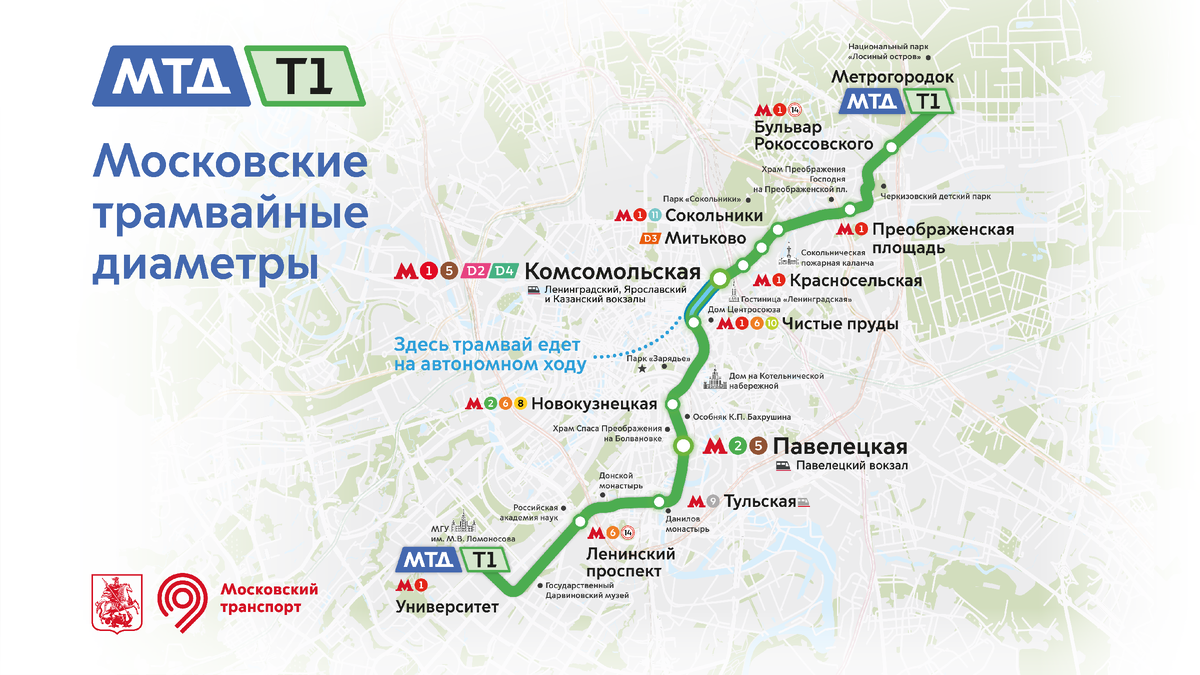 — На маршруте Т1 курсируют 50 современных автономных трамваев «Львенок-Москва». МТД станут мощным дополнением к существующей инфраструктуре метро и будут работать по стандартам наземного уличного метро, обеспечивая быстрые, комфортные и надёжные поездки с минимальными интервалами.
