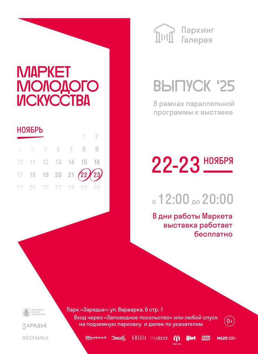🆓Арт-уикенд — часть параллельной программы междисциплинарного проекта «ВЫПУСК‘25» 🗓️22 и 23 ноября 📍Паркинг Галерея Зарядья На маркете молодого искусства более 50 выпускников 12 российских вузов представят работы в разных медиа — от живописи, графики и скульптуры до объектов из керамики и стекла. Все произведения можно будет приобрести и лично пообщаться с авторами. Также частью арт-уикенда станет образовательная программа, рассчитанная на художников, которые находятся на старте карьеры или еще продолжают свое обучение. Совместно с экспертами из сферы образования и маркетинга в искусстве мы проведем серию мероприятий о том, как художнику правильно себя презентовать, взаимодействовать с галереями и стать частью арт-рынка. Вторая часть программы подготовлена совместно с фестивалем паблик-арта «Здесь и Сейчас». Слушателей ждут лекции, паблик-токи, встречи с художниками из России, Беларуси, Китая и Турции и не только. 🆓Бесплатно На события образовательной программы требуется реги