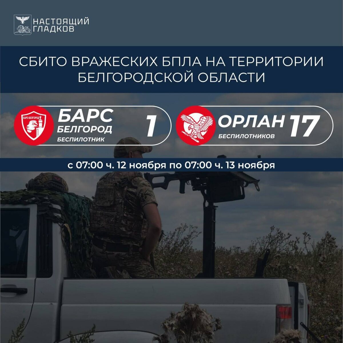 ⚡️Сводка по сбитым БПЛА за сутки в Белгородской области С 07:00 12 ноября по 07:00 13 ноября подразделения «БАРС-Белгород» и «Орлан» уничтожили 18 вражеских беспилотников. Силы ПВО продолжают круглосуточное дежурство, обеспечивая безопасность воздушного пространства региона. ❕ Жесть Белгород - подписаться 📸 Прислать новость: @predlozhka_zhest_bg