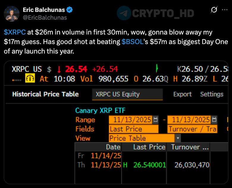 🔥 Eric Balchunas: Объем торгов ETF на #XRP в первые 30 минут с открытия фондового рынка превысил $26,000,000