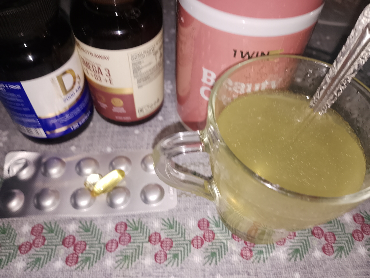 Моё утро начинается со стакана тёплой минеральной воды без газа. Во второй стакана воды я добавляю ложку коллагена, две капсулы витаминов и таблетка от гипертонии. Через пол часа завтракаю Сегодня у меня, по настроению, творог и тертое яблоко. Чашка цикория без молока. Яичница, кусок баварского хлеба Салат из помидорки, огурчика и маленький стебель сельдерея На обед у меня был грибной суп и кусок заварного хлеба Замариновала кусочки индейки с приправами Слегка обжарила их на сковороде с двух сторон по 6 минут На ужин пара кусочков индейки Получился белковый ужин В 21;30 Салат из огурца и помидора, лист салата и шпинат Два маленьких куска индейки Пью воду в течении дня. На ночь глюкофаж Всем здоровья, мира и добра!