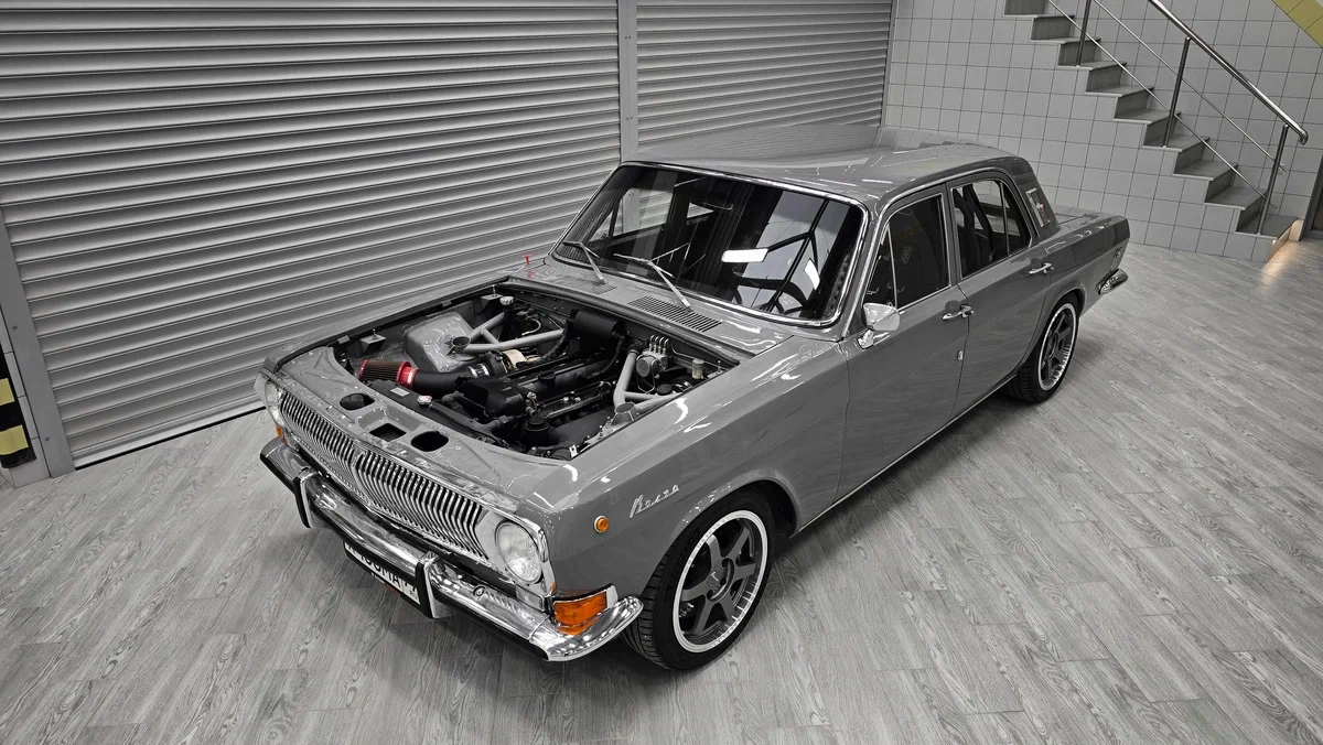 В столице выставили на продажу единственный в своем роде проект на базе ГАЗ-24: классическую «Волгу» 1969 года превратили в высокопроизводительный рестомод стоимостью 10 млн рублей. От оригинального автомобиля здесь фактически остался только кузов — все остальное сделано в индивидуальном порядке. Штатный 95-сильный двигатель уступил место легендарному Toyota 2JZ-GTE, форсированному до 700 л. с. благодаря кованой группе, увеличенным форсункам и турбине Garrett. При желании мощность можно «урезать» до 450 л. с. простой сменой режима. Тяга идет на заднюю ось через механическую коробку передач Toyota и редуктор с блокировкой. Подвеска полностью перенесена с Toyota Mark II, включая регулируемые рычаги и амортизаторы. Тормозная система HP Brakes дополнена контуром под гидравлический ручник. Заявленная максимальная скорость — 250 км/ч. Интерьер переделан подчистую: установлен каркас безопасности, спортивные сиденья- «ковши» с многоточечными ремнями, цифровая приборка и панель из карбона. Пред