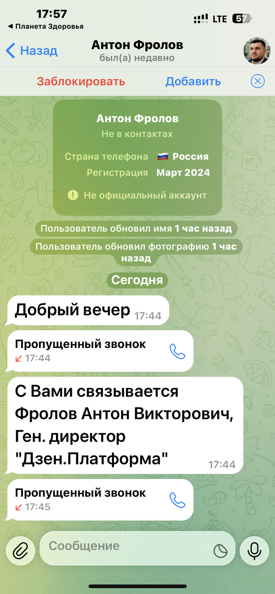Предупреждение для всех авторов Дхена. Это уже вторая попытка мошенников развести меня Сначала связываются через телеграм, понятно, что такие звонки сейчас не проходят, представляясь, как Фролов Антон Викторович, типа ген. директор "Дзен Платформа". К сожалению, первый случай, который произошел примерно месяц назад, я не успел зафиксировать и заскринить, так как фейковый аккаунт удалил сам телеграм, очевидно, что параллельно "разрабатывали" несколько потенциальных лохов, но видать сразу кто-то раскусил и отправил жалобу. Я даже расстроился, что не успел понять в чем суть. И вот мне повезло, дождался. Сразу понял, что мошенник, обратите внимание, аккаунт от марта 2024 года, Россия. Смотрим далее, пользователь сменил и имя и фото час назад. Скорее всего это чей-то взломанный аккаунт или купленный Фото такое солидное По поиску фото, а Антон Фролов личность медийная, становится понятно, что поработал ИИ Настоящий Антон Фролов Даже сходства никакого нет Честно говоря странно, что не п