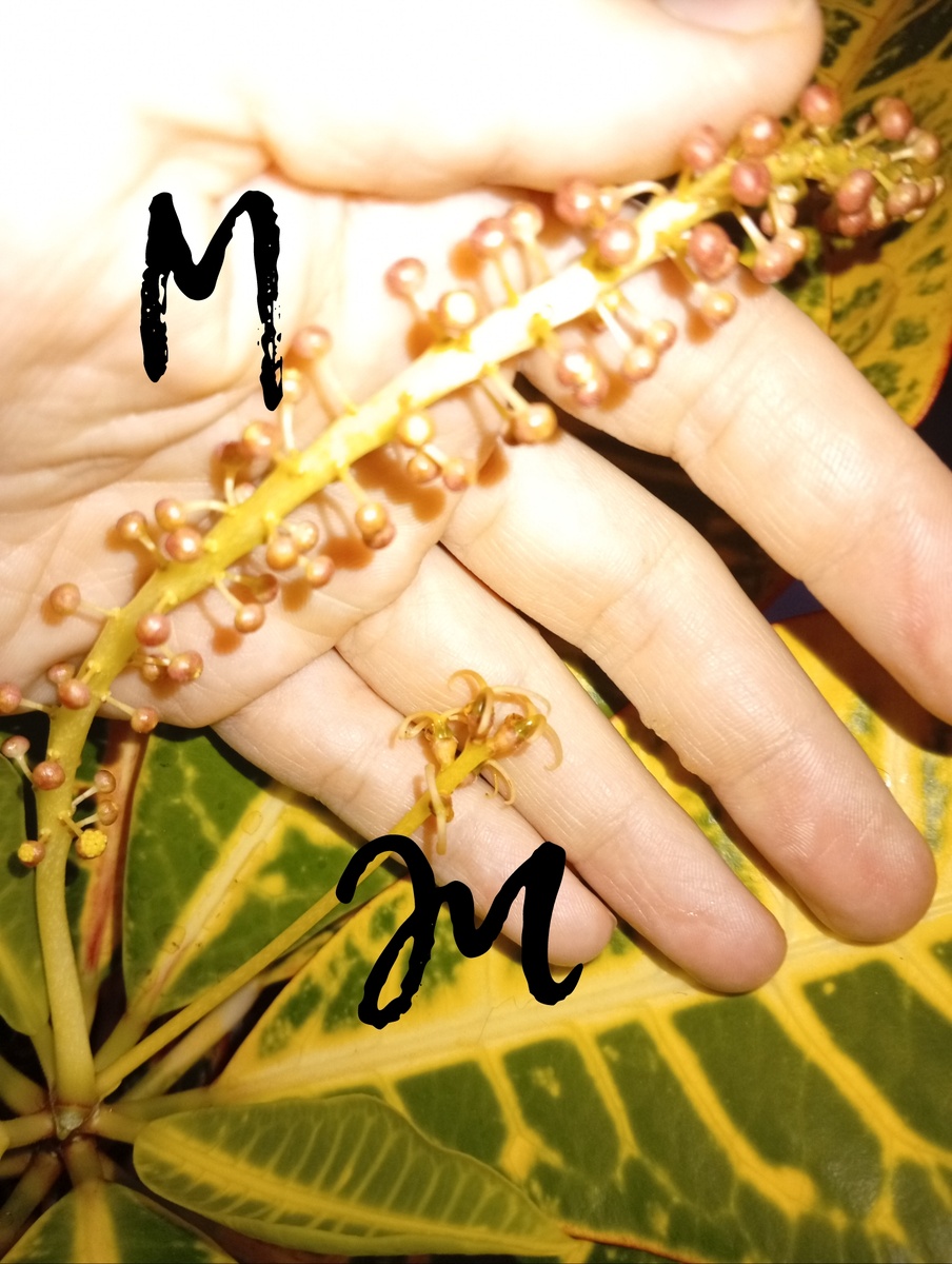 Здравствуйте, дорогие читатели! Меня зовут Настя, и я рада приветствовать Вас на странице этой статьи. Я хочу поделиться с Вами своим подходом к выращиванию и уходу за комнатными растениями. Я уверена, что у каждого из нас есть свой уникальный взгляд по уходу за растениями, и я надеюсь, что мои статьи станут поводом для интересных обсуждений и новых идей. В этой статье хочу поделиться с Вами еще одним зелёным экспериментом. Спасибо за внимание, и приятного чтения! В конце октября мой кротон неожиданно зацвёл. Наблюдая за этим процессом, я решила попробовать провести опыление растения. Вдохновением послужила статья об опылении антуриумов, и я задумалась — а почему бы не попробовать то же самое с кротоном? Я начала искать информацию и узнала, что кротон часто формирует как мужские, так и женские цветки. Процесс опыления оказался не таким простым, как казалось на первый взгляд. Готовность к опылению определяется по нескольким признакам: Если опыление прошло удачно, сформирует