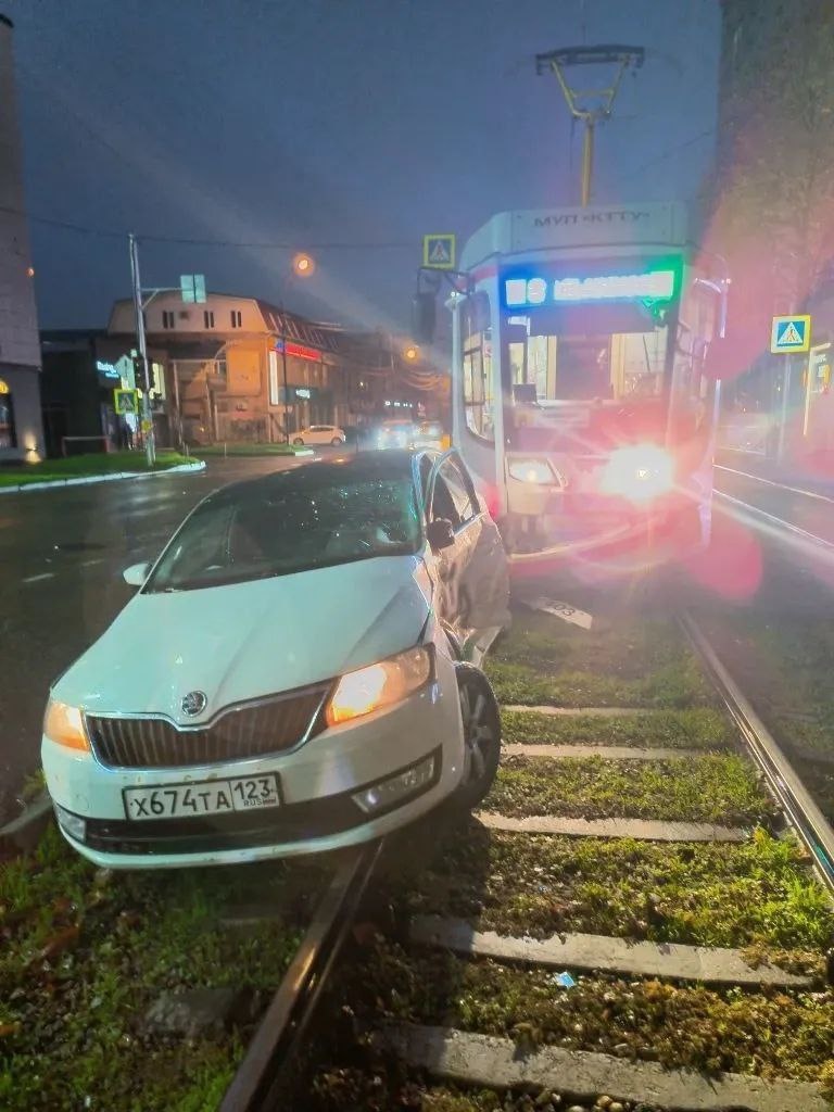Утреннее ДТП с трамваем и машиной такси на улице Коммунаров.