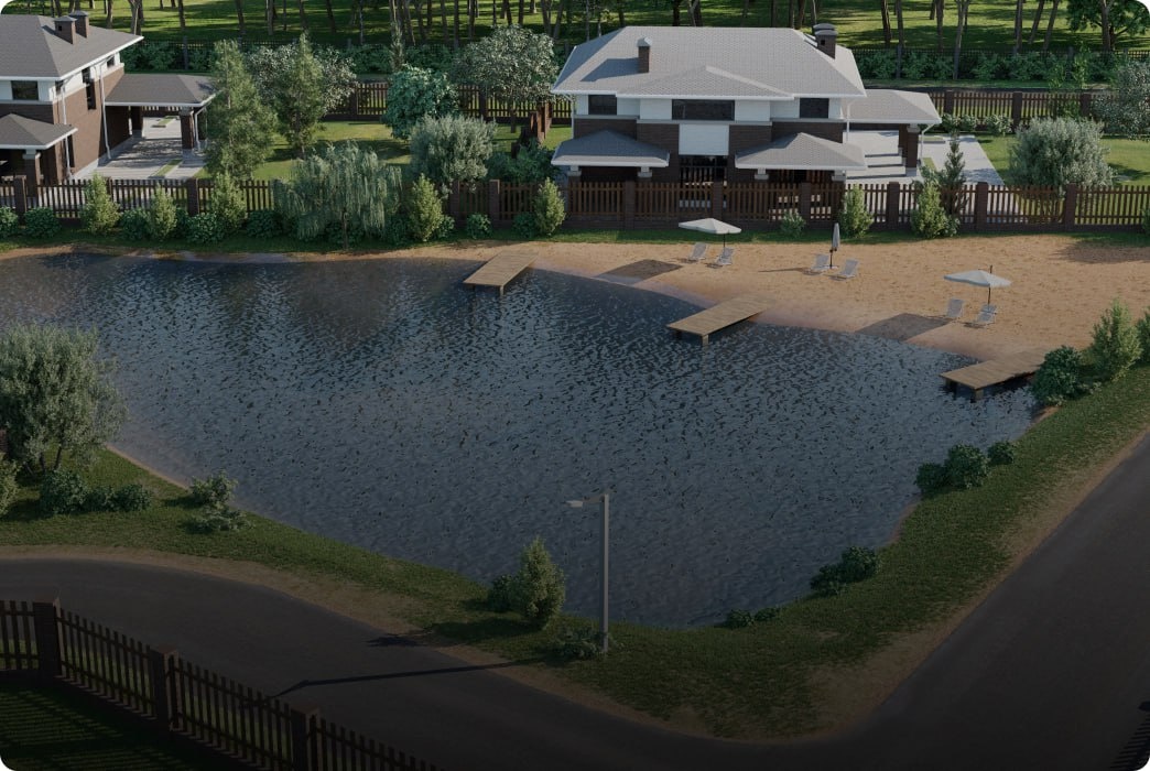 Лес и водоём рядом с посёлком создают атмосферу уединения, но не требуют полного отказа от удобств, если посёлок изначально спроектирован с учётом инженерных и бытовых потребностей.
