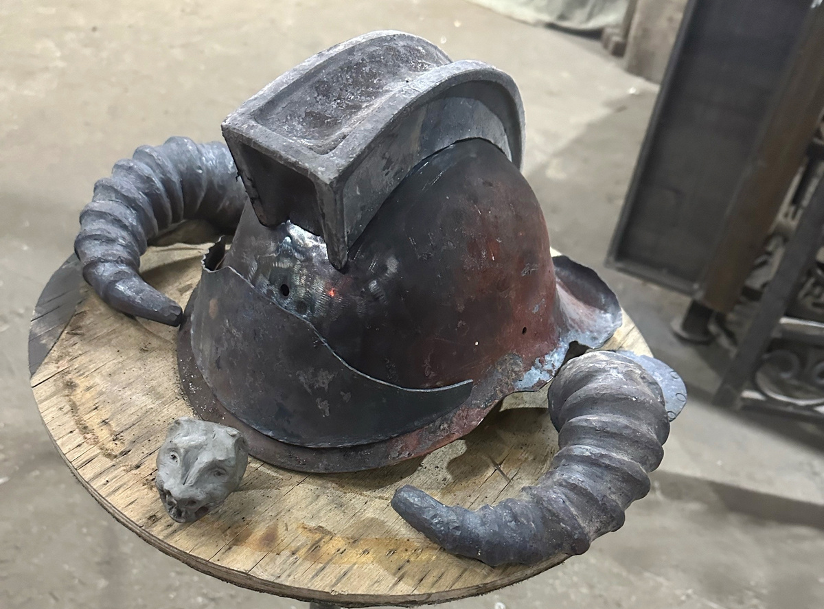Идея воплотить задумку из советской киноленты принадлежит не самому Антону. Это заказ от клиента. По сценарию фильма шлем был золотой. В нём было 5 килограммов 243 грамма драгоценного металла. На самом деле он был изготовлен в бутафорском цехе «Мосфильма» из простой пожарной каски. К ней приделали рога и покрасили золотой краской. За основу работы Антона Кирякова тоже взята пожарная каска. Все остальные элементы он выковывает из металла. - Рога полнотелые сделали из шестидесятого кругляка. Выковывали гребень из простой стали, потом из пластилина я вылепил тигра и сейчас кую его из металла. Никак не могу пока его укротить. Скоро должно получиться. Дней десять уже с коллегой трудимся над этим проектом, - раскрывает ход работ Антон Киряков. - Потом будет чистить и грунтовать, затем покрасим золотой краской. Сейчас у Антона вместе с экскурсиями в кузнице параллельно работает фотозона «Железного трона» и создаётся квест с аналогичным названием. На деньги с фотосессий он создаёт короны муж