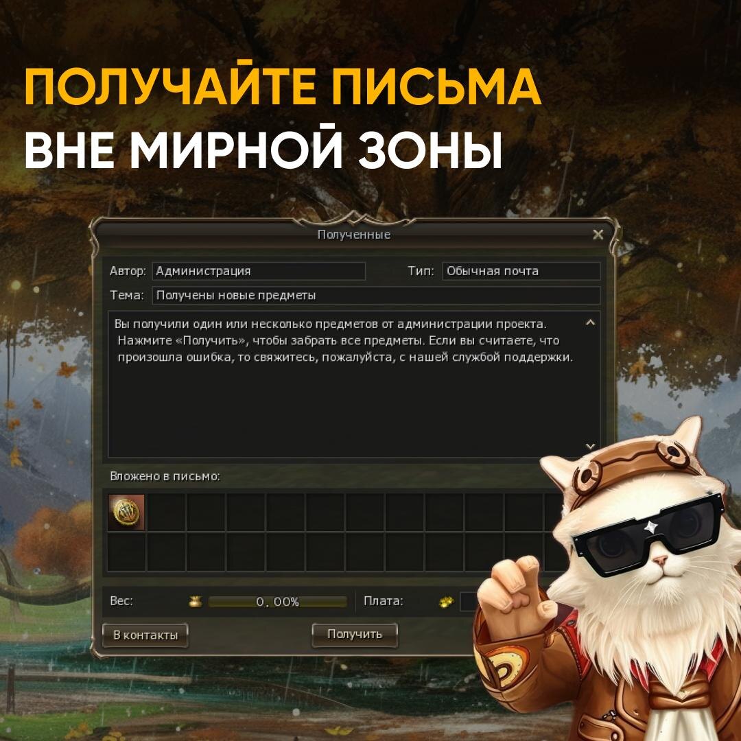 💗 Удобная фишечка в ленту Теперь получать внутриигровую почту можно вне мирной зоны, достаточно иметь для этого активный Премиум Аккаунт. Работает на всех серверах Скрайд, так что принять соски от друга можно будет прямо на споте! Для корректной работы — обновите игру с помощью лаунчера Прожмите ❤️ за такую фичу