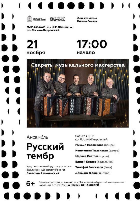 Приглашаем на концерт «Секреты музыкального мастерства» из цикла «Филармония школьника» 🎶 📆 Когда: 21 ноября ⏰ Во сколько: в 17:00 🎭 Где: в Доме культуры Биокомбината (г.о. Лосино-Петровский, пгт. Биокомбината, д. 17А) 🪗 Приходите насладиться звучанием ансамбля «Русский тембр» и поддержать учащихся Детской школы искусств г.о. Лосино-Петровский имени И.Ф. Обликина, которые выступят на одной сцене с профессионалами. 🎶 Не пропустите этот уникальный концерт! ➡️ ВХОД СВОБОДНЫЙ ⬅️