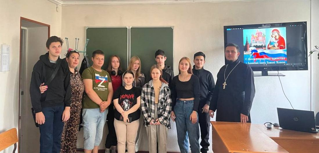 3 и 5 ноября 2025 года, прошли мероприятия, посвященные празднику Казанской иконы Божией Матери и Дню народного единства, для студентов ГПОУ «Калтанский многопрофильный техникум» и учащимихя 5-9 классов МБОУ «СОШ №1». По благословению благочинного Калтанского округа протоиерея Сергия Добровольского, встречи провел клирик храма Покрова Божией Матери г. Калтана иерей Даниил Повзик. Священнослужитель подробно рассказал студентам и школьникам историю Казанской иконы Божией Матери, одной из почитаемых святынь Русской Православной Церкви, а также историческую связь и значение Дня народного единства. Батюшка подчеркнул, что праздник Дня народного единства напоминает о значимости внутреннего духовного единения, милосердия, справедливого устройства общества и чувства соборности, сформированного православной верой. Именно эти ценности стали фундаментом русской культуры и основой российского государства, обеспечивая условия для успешного развития и благоденствия народа. Дети проявили живой интере