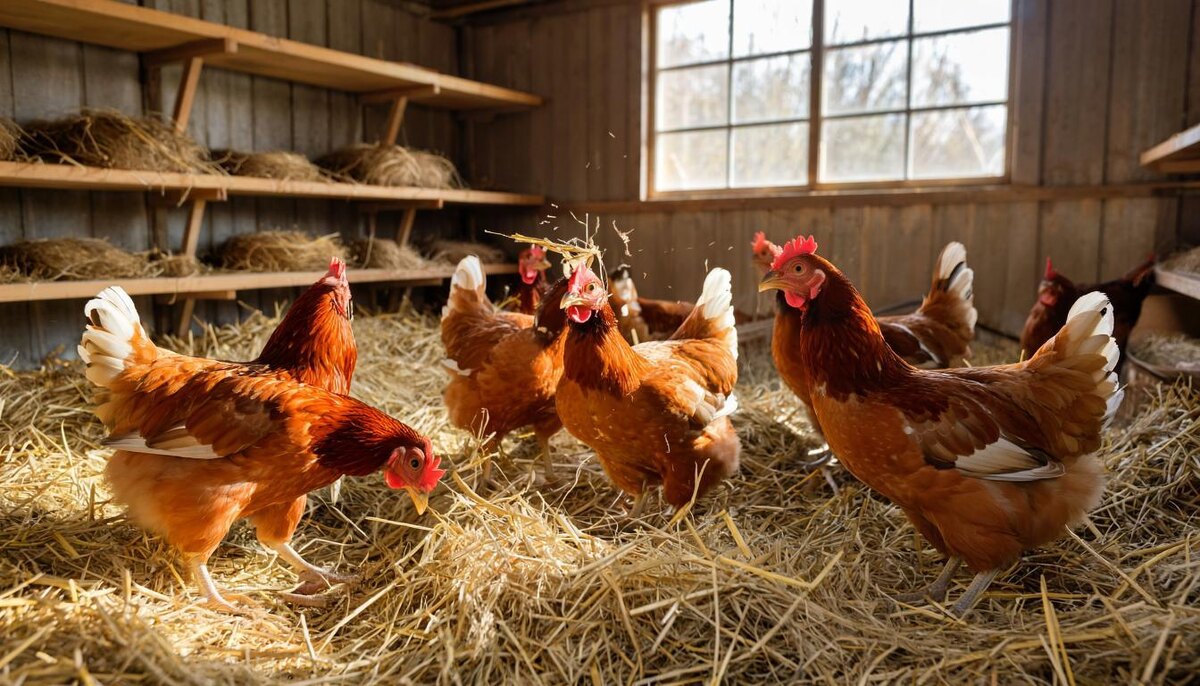 Результат: Через 10 дней исчезли белые прожилки в помёте — признак дисбактериоза. Почему вредит: Солома почти не содержит питательных веществ. Куры, клевавшие её, получали 0% клетчатки (требуется 25–30% в рационе для ЖКТ).