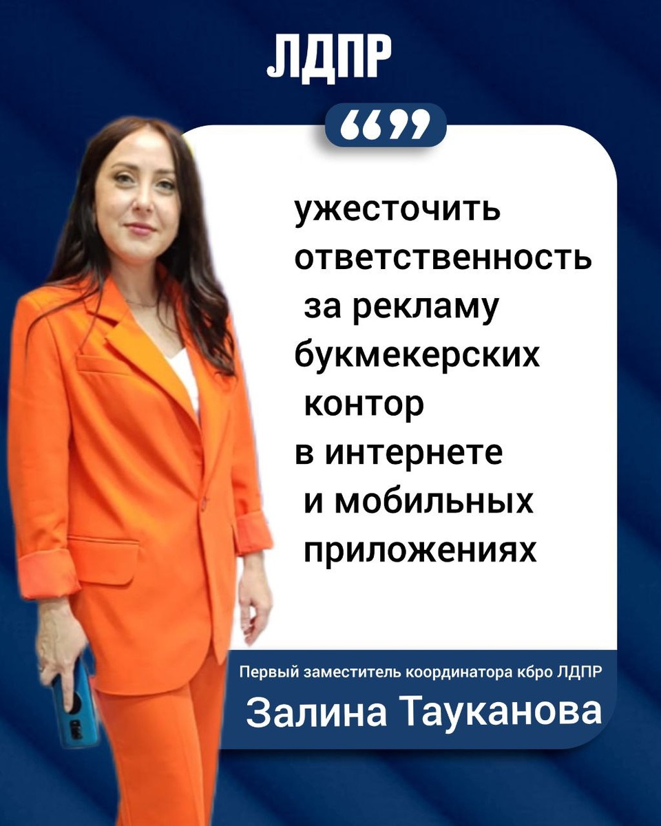 ЛДПР бьет тревогу: реклама букмекерских контор заполонила интернет и приложения! 📢 Партия внесла законопроект, предлагающий ввести отдельную статью в Кодекс об административных правонарушениях для более строгого наказания за нарушения правил рекламы азартных игр и ставок. Мы наблюдаем массовое проникновение такой рекламы в социальные сети, мобильные приложения и даже в контент для детей, что делает её крайне опасной. Цель инициативы — пресечь незаконную и агрессивную рекламу, защитить детей, подростков и взрослых от скрытого гемблинга. Законопроект предусматривает штрафы: от 5 000 рублей для граждан, до 100 000 рублей для должностных лиц и внушительных 800 000 рублей для юридических лиц, либо приостановку их деятельности до 90 суток. «Инициатива абсолютно правильная, пора ограничить наших людей от этих «нежданчиков», — комментирует первый заместитель координатора Кабардино-Балкарского регионального отделения ЛДПР Залина Тауканова. — Важно защитить наше общество от деструктивного в