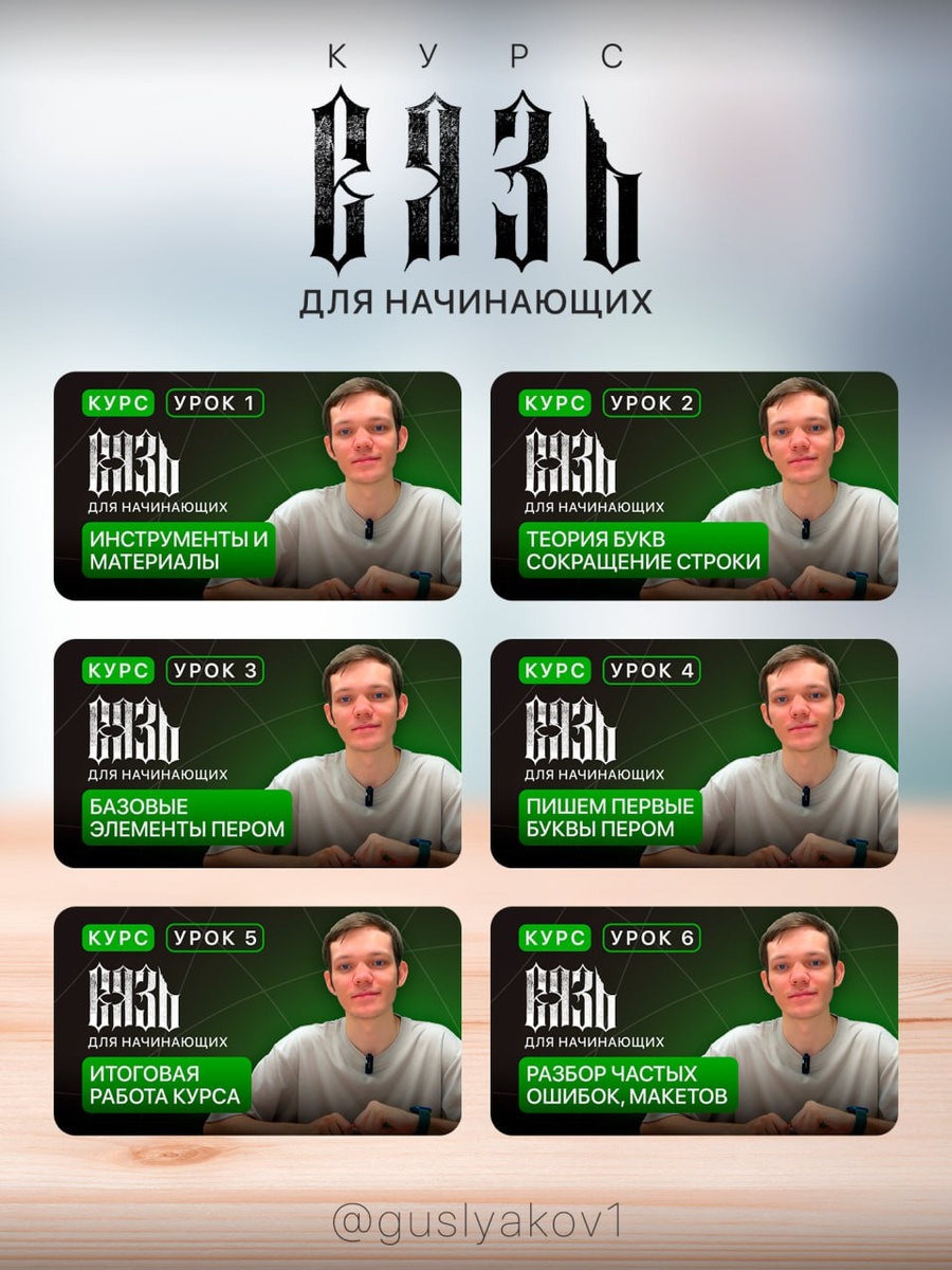 Курс по Вязи для начинающих полностью доступен! Урок 1. Вводный урок. Разбор инструментов и материалов для каллиграфии. Урок 2. Теория букв, разбор скелетов букв, виды сокращения строки. Урок 3. Изучаем базовые элементы плоским пером. Урок 4. Пишем первые буквы, слова, сокращения строки. Урок 5. Разбор итоговой работы курса. Урок 6. Разбор частых ошибок на начале изучения каллиграфии, разбор ошибок в логике букв, где использовать вязь. + ДОСТУП в закрытый чат-комьюнити 🛒 Начать проходить курс!