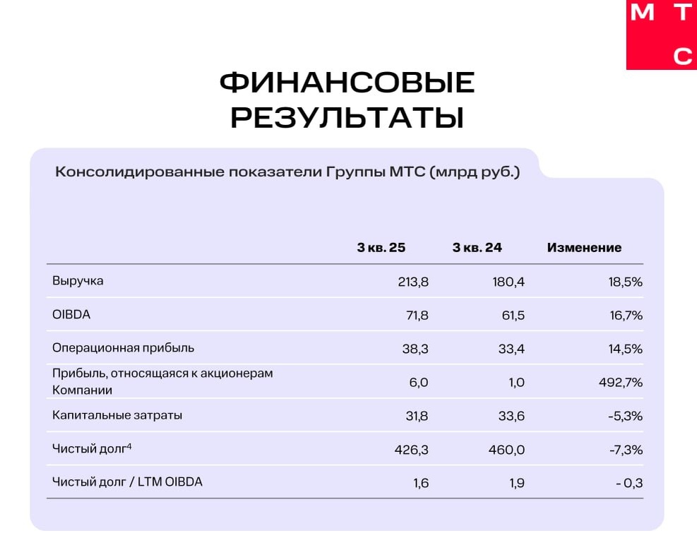 📱 МТС сегодня отчитался за 3 квартал: прибыль выросла в 6 раз 🔸 Выручка — 214 млрд рублей (+19% год к году) 🔸 OIBDA — 72 млрд рублей (+17% год к году) 🔸 Чистая прибыль — 6 млрд рублей (6x рост год к году) У компании сокращается чистый долг — с 460 до 426 млрд рублей за год. При этом отношение чистого долга к OIBDA снизилось с 1,9x до 1,6x. Компанию поддерживает продолжающееся снижение ключевой ставки, так как падают процентные расходы (долги по плавающей ставке) и повышают прибыль. Компания также сегодня урегулировала спор с ФАС по делу, которое тянулось с весны 2024 года. #Отчетность #MTSS @if_news