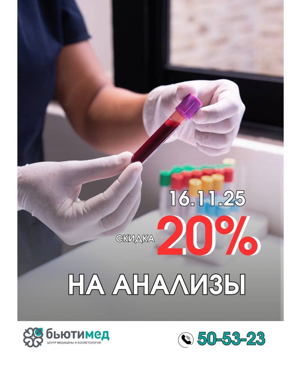 16 ноября — день анализов! И только в этот день действует скидка 20%. Почему важно сдавать анализы регулярно? ✔ Помогают выявить скрытые воспаления и нарушения обмена веществ ✔ Контролируют работу печени, почек, щитовидной железы ✔ Показывают уровень холестерина, сахара, ферритина и других важных показателей ✔ Дают врачу полную картину вашего здоровья Анализы — это базовый шаг к пониманию своего организма и сохранению энергии на годы вперёд 💎 📍📍 Ульяновск, ул. Карбышева, 30 📞 +7 (8422) 50-53-23 📱WhatsApp +79272706126 или через наш сайт 🌐 Берегите здоровье — подарите себе спокойствие и уверенность ❤️ #БьютиМед #НеделяЩедрости #10летБьютиМед #анализы #Ульяновск #здоровье