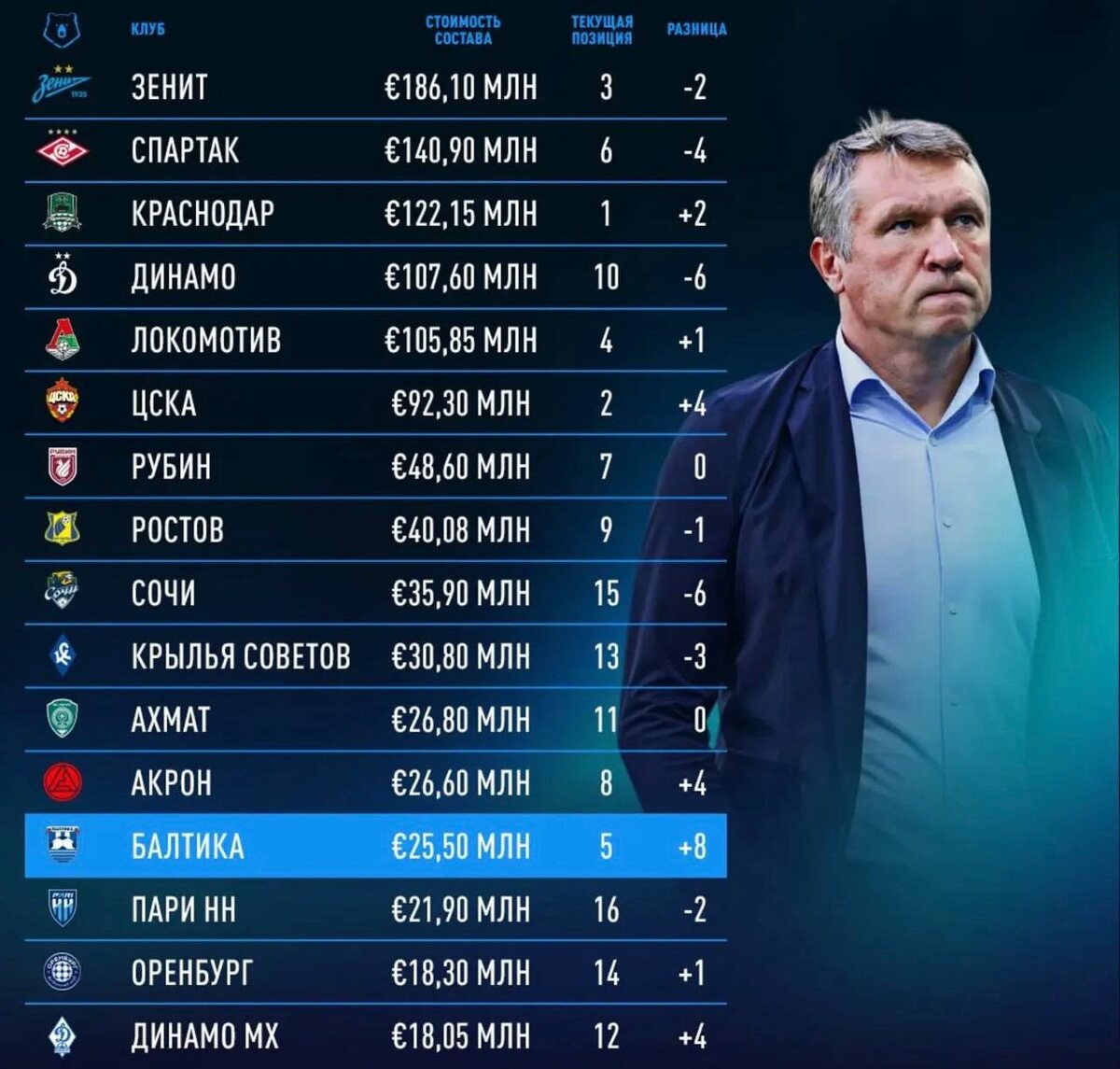 📊🐻 Интересная сравнительная таблица РПЛ Соотношение трансферной стоимости состава и их текущая позиция в таблице Акрон, Балтика, Динамо Мх 👏 ➡️ Подписаться на ФутХайп