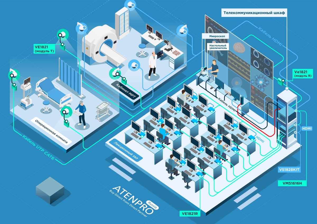 Учебное оборудование со стола лектора (настольный увеличитель; микроскоп; рабочий ноутбук; монитор, дублирующий информацию с видеостены) подключается через высокоскоростные кабели HDMI модели ATEN 2L-7D15H. Ау