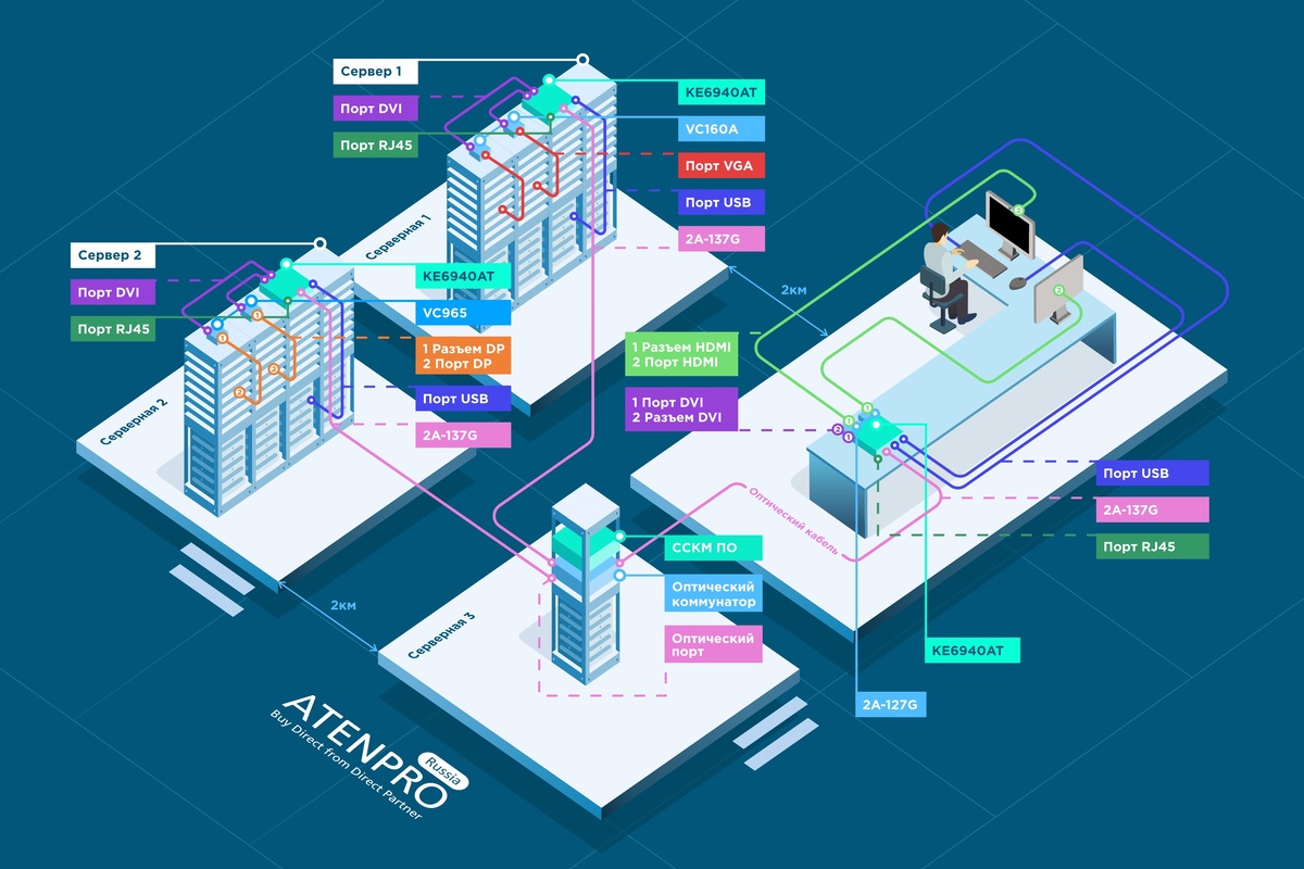 Наиболее рациональным решением стало использование KVM удлинителей по оптоволокну. Эти устройства позволяют передавать сигналы клавиатуры, мыши и видео по одному оптоволоконному кабелю на значительные расстояния. Для реализации данной задачи были выбраны KVM удлинители с поддержкой двух мониторов. Это позволило передавать видеосигнал с обоих видеовыходов серверов 1 или 2 на два монитора удаленного рабочего места без потери качества. Для каждого из двух серверов потребуется установить по одному KVM передатчику ATEN KE6940AT (с доступом по IP и поддержкой двух дисплеев), а на удаленном рабочем месте оператора - один KVM приемник ATEN KE6940AR.