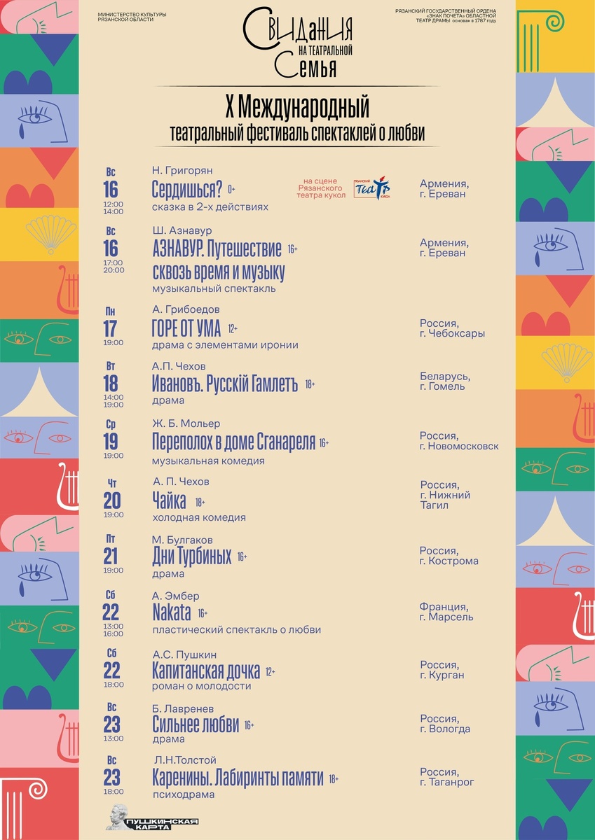 Опубликована афиша Х Международного фестиваля спектаклей о любви «Свидания на Театральной. Семья». Об этом сообщает пресс-служба Рязанского театра драмы. Он состоится с 16 по 23 ноября 2025 года. В рамках фестиваля пройдут творческие встречи, обсуждения спектаклей и специальные проекты, направленные на вовлечение зрителей в театральный процесс. В конкурсной программе будут представлены постановки: