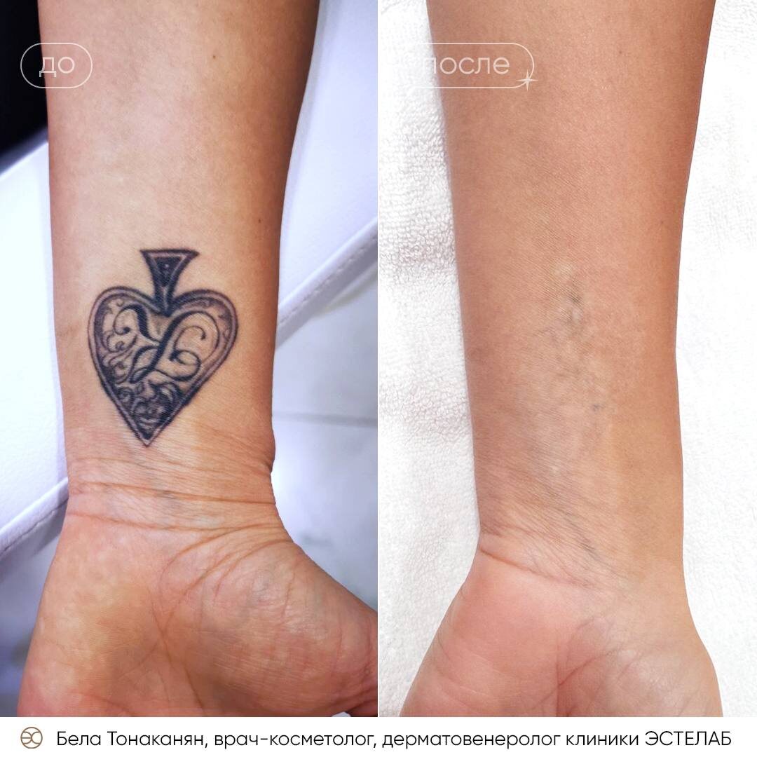 РЕЗУЛЬТАТ УДАЛЕНИЯ ТАТУИРОВКИ 👩⚕️Работа Белы Тонаканян, врача-дерматолога, косметолога клиники Эстелаб. Современные пикосекундные лазеры позволяют убрать татуировку без ожогов, рубцов и долгого восстановления. Ультракороткие импульсы света точечно воздействуют на пигмент, разрушая его механически. Фрагменты краски затем естественно выводятся через лимфатическую систему, а кожа постепенно очищается и восстанавливается. Далее организм сам постепенно выводит остатки краски, и рисунок становится все светлее после каждой процедуры. Для уточнения подробной информации или записи на процедуру - оставляйте «+» в комментариях.