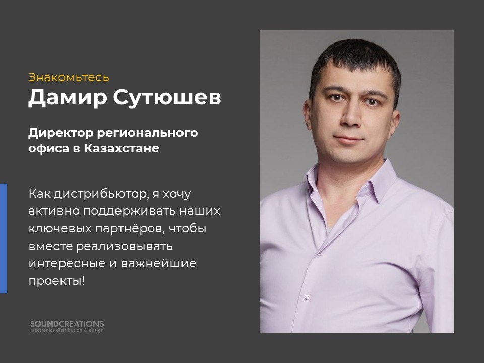 Рады представить нового члена команды Sound Creations Electronics Trading – Дамира Сутюшева – директора регионального офиса в Казахстане
