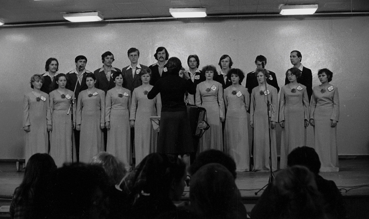 На сцене актового зала ремонтно-инструментального завода выступают в том числе и артисты художественной самодеятельности цеха приспособлений РИЗа. 1981 год.