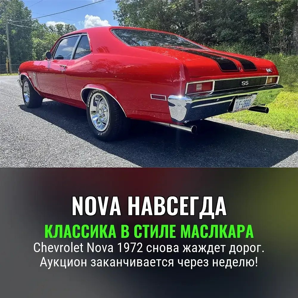 Ах, вот она — Chevrolet Nova 1972: столько пафоса и ностальгии на квадратный метр, что даже резина Cooper Cobra начинает жаловаться от волнения. 😏 Машину восстановили буквально с нуля, закинули туда свежий малоблок, навесили современную мультимедию с Bluetooth, щеголяют новыми цифровыми приборами и подсветкой в салоне. Но главное — этот блестящий Candyapple Red, чёрные полосы и вечная хромированная радость на 15-дюймовых Rally-дисках. Когда-то (а было такое вообще – когда-то?) подобные авто рекламировали как «лучший способ посмотреть Америку». Ну да, а теперь за Nova голосуют механики — якобы проще и надёжнее ничего не существует. Конечно, ведь в 70-х строили серьезно. В общем, если кто ещё не устал от бесконечного сериала под названием «Американская мечта в металле» — Nova скоро отъедет новому владельцу. Финал аукциона – 18 ноября. Сделайте ставки, господа зрители! 🍿🚗 Культура TODAY / Зарубежная культура