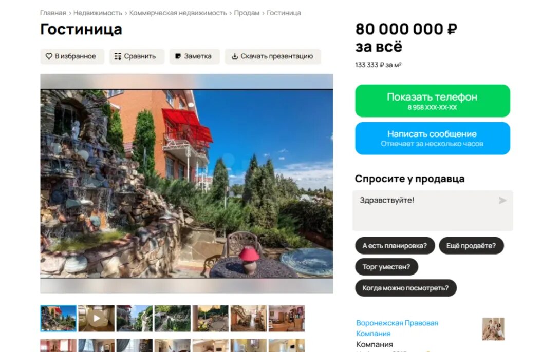 Здание занимает 600 квадратных метров и находится рядом с путепроводом недалеко от остановки «Работница». Объявление о продаже появилось на «Авито». Как рассказывает собственник, расположение гостиницы идеально для путешественников из-за близости железнодорожного вокзала. Гостиница включает семь номеров категории VIP с джакузи и дизайнерским ремонтом, а на втором этаже здания находится зимний тропический сад с пятиметровыми лианами. Еще среди преимуществ называют зрелищный вид из окна. Гостиница расположена на 5,5 сотках земли. Покупателю обещают немалый и прозрачный доход. За готовый бизнес продавец просит 80 млн рублей.