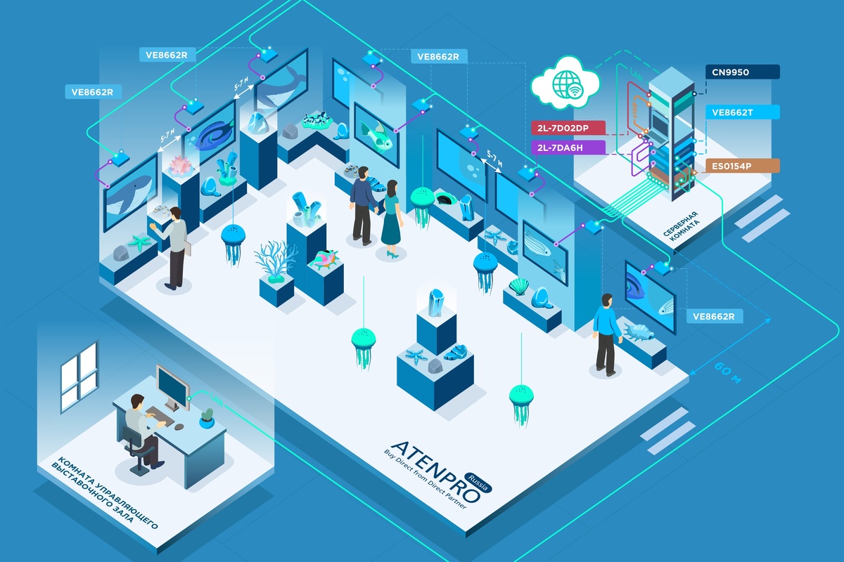 Необходимо организовать систему сквозного показа единого видео-контента на 9 экранах, расположенных по периметру большого выставочного зала Музея геологии (размер зала ~ 20*12 м). Контент: плавающие в водах океана большие киты, плавно проплывающие между всеми 9-тью экранами по периметру зала. Экраны в зале, размещенные на расстоянии 5-7 метров для лучшего обзора, имитируют иллюминаторы, погружая посетителей выставки в атмосферу морских глубин с плавающими гигантами. Контент должен транслироваться из удаленной серверной, находящейся на расстоянии около 60 метров от выставочного зала с экранами. Также, необходимо предусмотреть возможность управления контентом по IP через интернет, для экстренного удаленного подключения администратора по сети из любой точки мира. Дополнительно необходимо иметь возможность подключиться локальным ноутбуком для управления непосредственно в серверной.