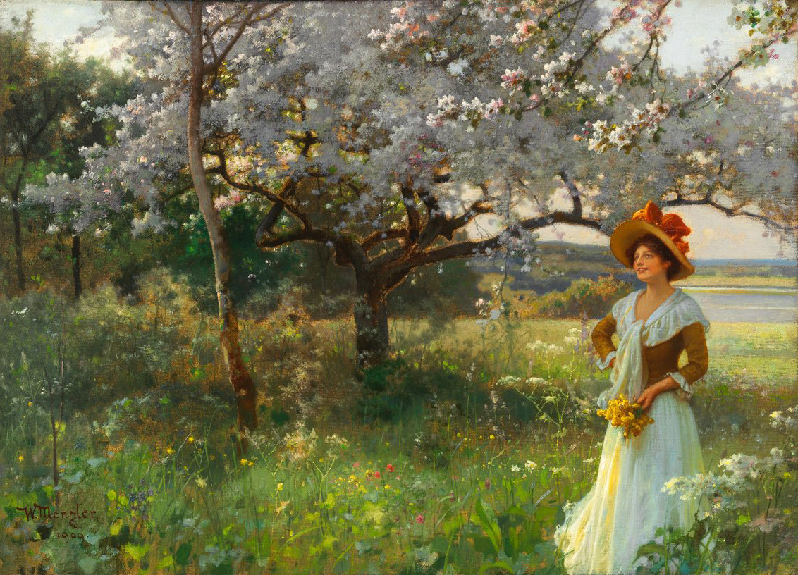 Вильгельм Менцлер (1846-1926), работавший в Мюнхене, известен своими жанровыми картинами, и работа под названием «Весна» – одна из его лучших работ. Картина поступила в коллекцию Музея изящных искусств Будапешта в 1912 году из имения графа Дьюла Андраши. Последний владелец замка Краснахорка (ныне замок Красна Горка, Словакия) обнаружил эту картину на выставке в мюнхенском Стеклянном дворце, где и приобрёл её для своей картинной галереи. Цвета картины гармоничны и сдержаны. На фоне цветущих фруктовых деревьев улыбающаяся молодая женщина идёт по цветущему лугу, а яркий весенний солнечный свет чередуется с тенями на её шляпе и платье. Её одежда отражает моду того периода, когда была написана картина, тогда было принято украшать тонкие ткани цветами, перьями или лентами. Менцлер любил изображать на своих картинах радостные повседневные моменты, и его весенний образ излучает гармонию и блаженство пркрасных дней. Картина была написана в 1909 году. Её размер 35.8 x 49.3 см. P.S. Приглаша