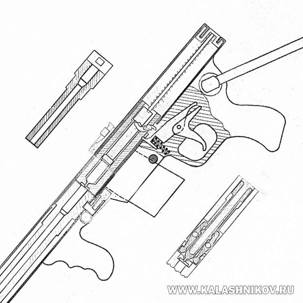 Перемещение боевых упоров в отпертое и запертое положение должно было осуществляться движением ударника при его взведении в ходе отката подвижной системы и в конце наката при спуске подвижной системы с боевого взвода. Взведение ударника осуществлялось с помощью рычага, установленного в затворе и качающегося в вертикальной плоскости.