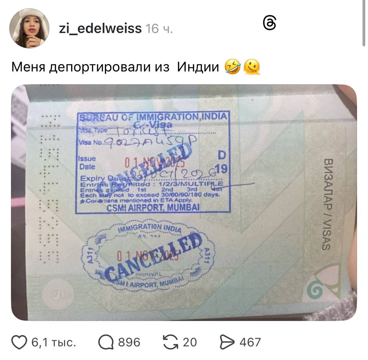 Девушку депортировали из ИНДИИ — об этом она рассказала в Threads