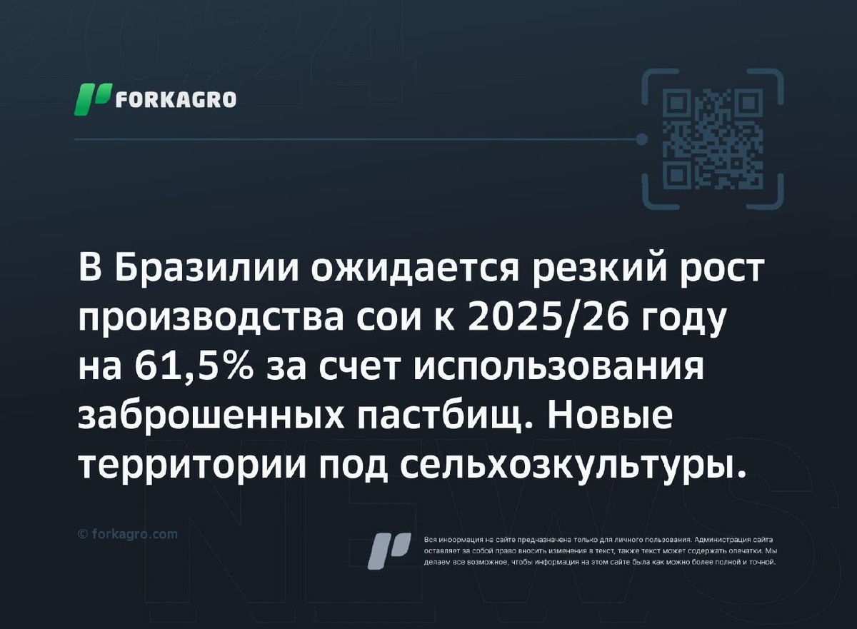В Бразилии ожидается резкий рост производства сои к 2025/26 году на 61,5% за счет использования заброшенных пастбищ. Новые территории под сельхозкультуры. По данным Itau BBA, производство сои в Бразилии к 2025/26 году может вырасти на 61,5% за счет использования заброшенных пастбищ под сельскохозяйственные нужды. За последние 18 лет страна постоянно увеличивала площади под соей. Ожидаемый урожай в 2025/26 году составит 177 млн тонн. На 9 ноября посевы выполнены на 47% от запланированных площадей. Перейти к источнику