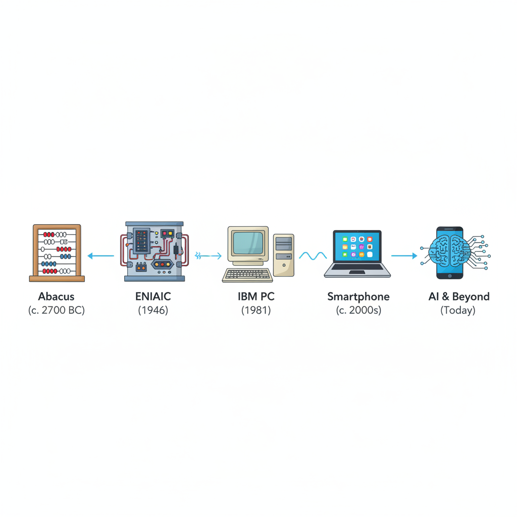 - XXI век: Мощные компьютеры, компактные устройства, облачные технологии, искусственный интеллект.