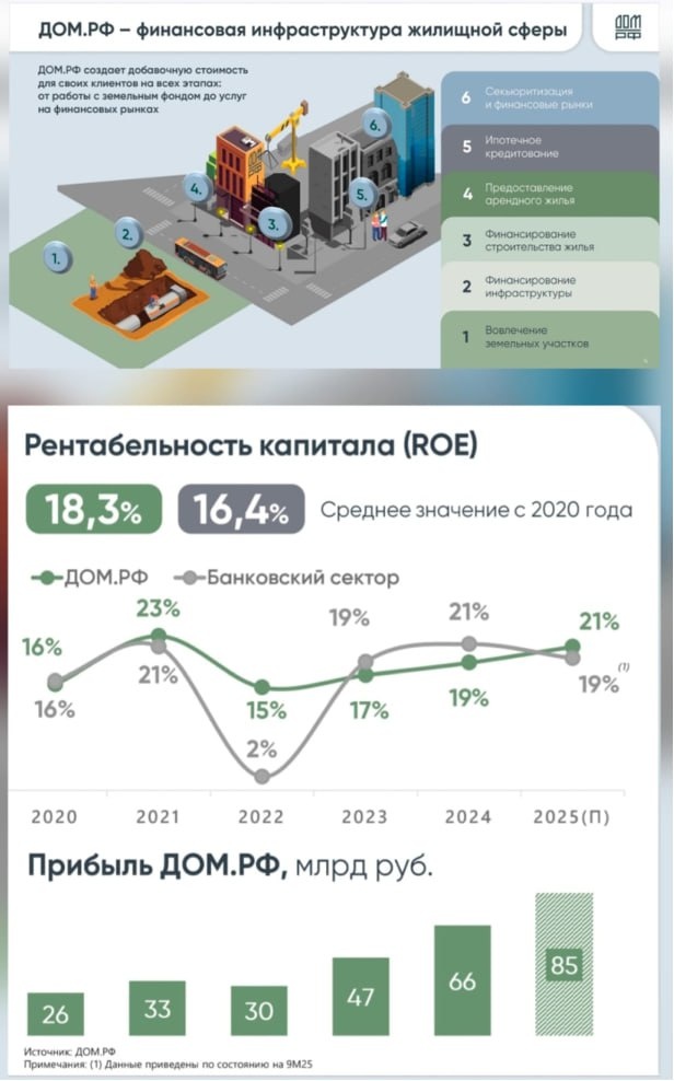 ДОМ.РФ: в ожидании IPO 10 ноября компания объявила о своем намерении провести IPO, вчера получила листинг на Московской Бирже. Акции ДОМ.РФ будут включены в первый уровень списка ценных бумаг. Детали размещения - Сделка пройдет в формате cash-in, все средства, полученные в результате допэмиссии, пойдут на развитие компании. - Локап период, в течение которого компания обязуется не отчуждать акции, составляет 180 дней. - Основной акционер - Российская Федерация - не будет продавать принадлежащие ей акции в рамках размещения и сохранит мажоритарную долю. Финансы По итогам 9 месяцев 2025 картина такая: — Собственный капитал — 416 млрд рублей. Среднегодовой темп роста с 2023 года составил 15%, и уже +10% с начала года. — Чистая прибыль — 62,3 млрд (+7% год к году). Компания стабильно платит дивиденды с 2010 года и планирует распределять 50% чистой прибыли по МСФО. — Чистая процентная маржа — 3,7%. — COR (стоимость риска) — 0,6%, что ниже среднего по рынку. — CIR (отношение операционны
