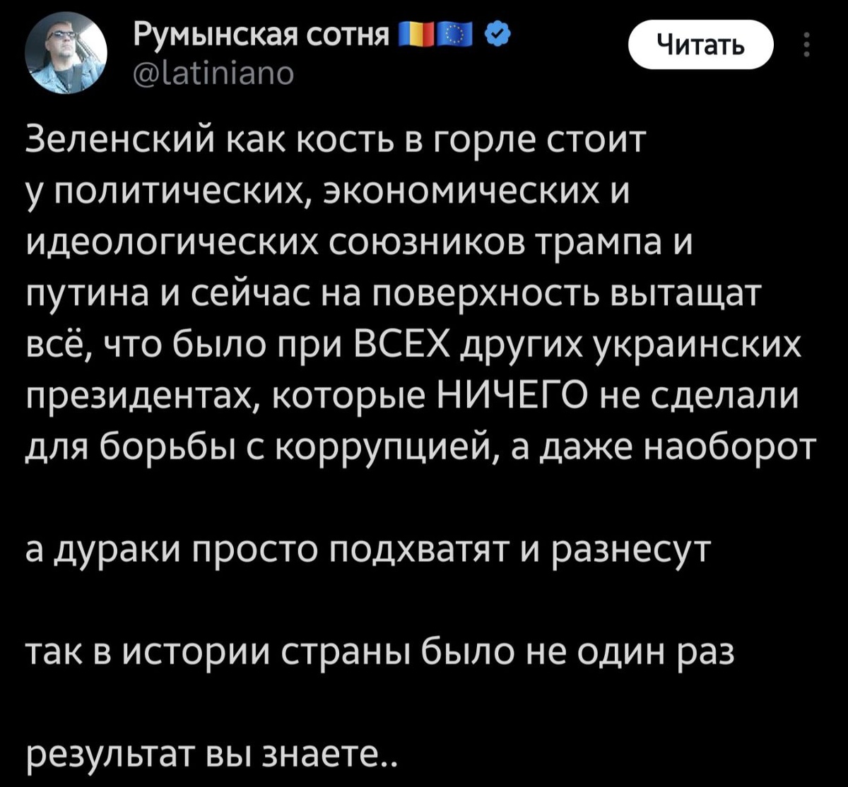 Поймите, он ни в чем не виноват. Как он мог что-то украсть, он же еврей? А, стоп, это другая отмазка. Во всем виноват коррупционер Янукевич и советские вожаки Украины. При них все началось. Зеленский, наоборот, пытается бороться с коррупцией. Даже против трех граждан Израиля санкции ввел. Смелый и честный лидер. Яблочный Стас