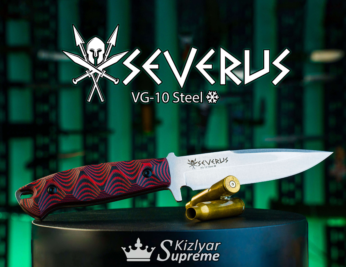 Яркий и бескомпромиссный Severus. В его основе клинок формы spear-point из японской стали VG-10. Созданная специально для ножей, она прошла проверку временем и остается одним из самых сбалансированных сплавов, а фирменная криообработка Kizlyar Supreme доводит её свойства до совершенства. После сложного цикла термообработки VG-10 показывает твердость в районе 61 HRC. Даже при такой твёрдости, она сохраняет высокую ударную вязкость, долго удерживает остроту режущей кромки и при этом клинок практически не требует ухода и довольно прост в заточке. О том, что сталь VG-10 прошла криообработку, владельцу сообщит дополнительная гравировка снежинки на клинке сразу за названием стали. Вишенкой на торте станут стильные, под стать ножу, ножны из толстой черной кожи с эффектным тиснением или чехол из кайдекса на ваш выбор. Официальный интернет магазин ножей Kizlyar Supreme : >> на сайт