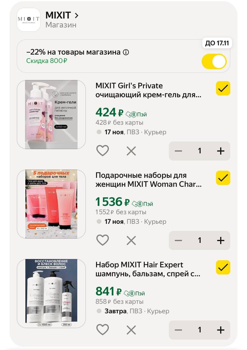 Скидка 22% на MIXIT по промокоду 4ZRNE1TB Набор MIXIT Hair Expert шампунь, бальзам, спрей с коллагеном и биотином для волос 841 ₽ | 1078 ₽ Подарочные наборы для женщин MIXIT Woman Charm, гель для душа и крем для тела, 5 шт 1536 ₽ | 1970 ₽ MIXIT Girl's Private очищающий крем-гель для интимной гигиены, 2 шт 424 ₽ | 543 ₽ Вся подборка тут 👉 ССЫЛКА ⭐️NORTME-41-AF - минус 2000₽ на один любой заказа от 8000₽ (для новых пользователей) ⭐️BER103-AF — минус 100₽ на один любой заказ от 5000₽ ✅ Подписаться 🔣 Бот с промокодами