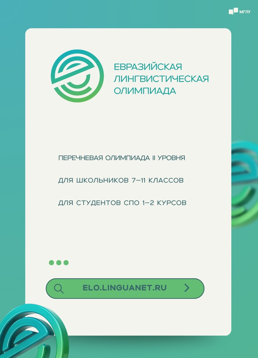 Евразийская лингвистическая олимпиада: поступи в МГЛУ без экзаменов МГЛУ приглашает школьников из России и иностранных граждан поучаствовать в «Евразийской лингвистической олимпиаде» В карточках рассказали всё самое важное про языки, ключевые даты и льготы, которые участие в олимпиаде даёт поступающим ⬆️ 🔗 Все подробности на сайте олимпиады: elo.linguanet.ru