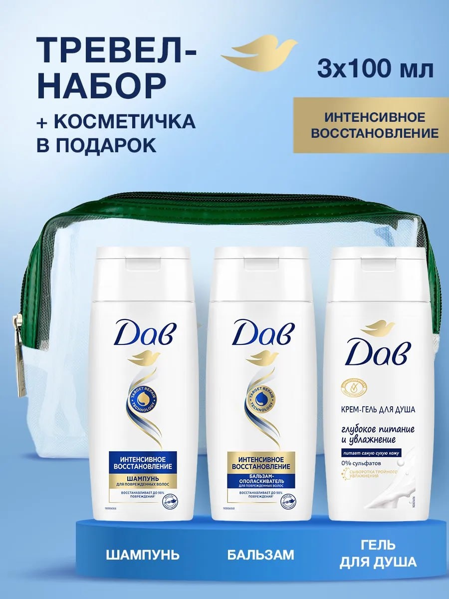 Дорожный набор шампунь, бальзам и гель для душа в косметичке. Дорожный набор средств для ухода за волосами и телом в удобной косметичке от Дав станет вашим незаменимым спутником во время поездок, путешествий или отпуска. Компактная косметичка с продуманной комплектацией обеспечит качественный уход за волосами и телом в любых условиях. Цена: 323 руб. Ссылка: https://www.wildberries.ru/catalog/425142681/detail.aspx?targetUrl=SN