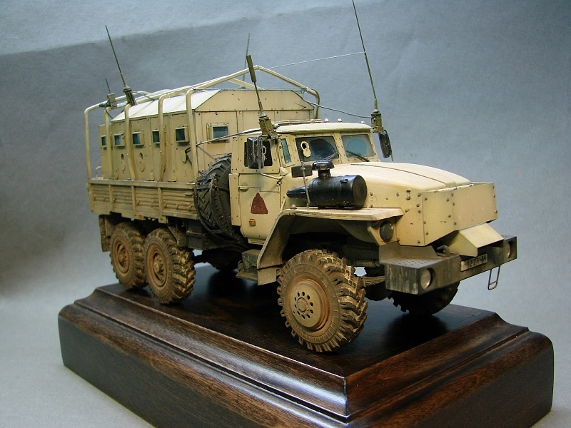 УРАЛ 4320 "Звезда-В"(он же пакемон) ВВ МВД. Чечня,ноябрь 2002 г. Максим Ведмедовский Trumpeter, 1:35 ================================ По доработкам: Заменил колеса на миниарм, косячный трамповский движек тоже заменил(что бы вопросов не было) от алангера(хотя его не видно и можно было не менять)) НО как говорится так душе спокойней, прокинул топливо провод, установил переговорное устройство в кабину, развернул воздушный фильтр в другую сторону(так как стоял на прототипе)на сколько знаю этот вариант мог быть разным изо разных двигателей(могу и ошибатся), высверлил все бойницы, антенны сделал из подручного хлама от моделей, гос.номера распечатал на фотобумаге(странно что они гражданские)как говорит один из моих товарищей который побывал и в первую и во вторую компанию,утверждает что номера меняли сами водители.сумки в салоне кунга подобрал из остатков от Блэк-Дога, дуги сделал из проволоки(раскатал на вальцах)фары воткнул от эльфа,скамейки в кунг поставил из остатков деталей,использовал
